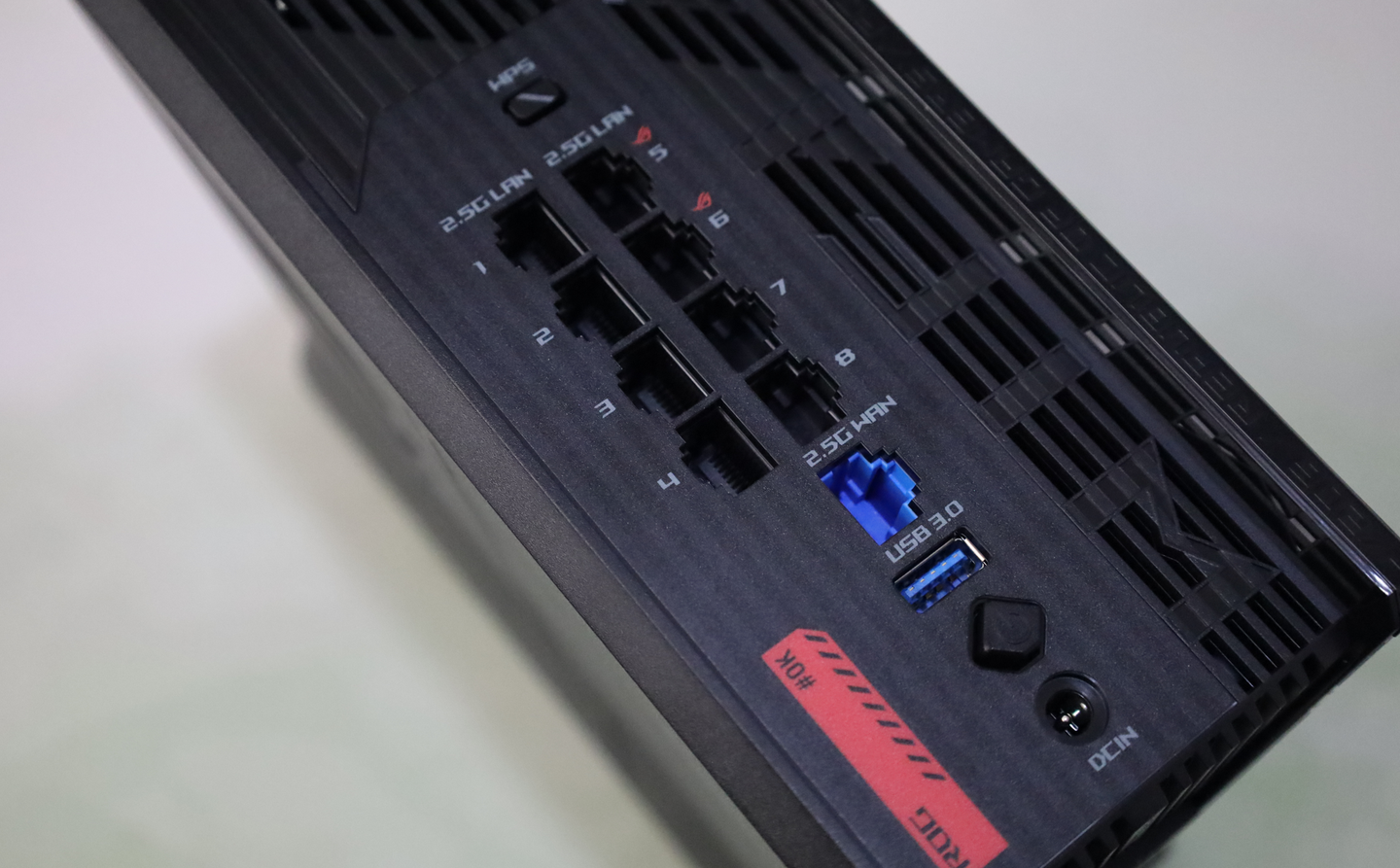 8个左右对称的Lan口,均为2.5G,右侧从上到下1、2为电竞专属口,有一个赛博之眼的红色标记: