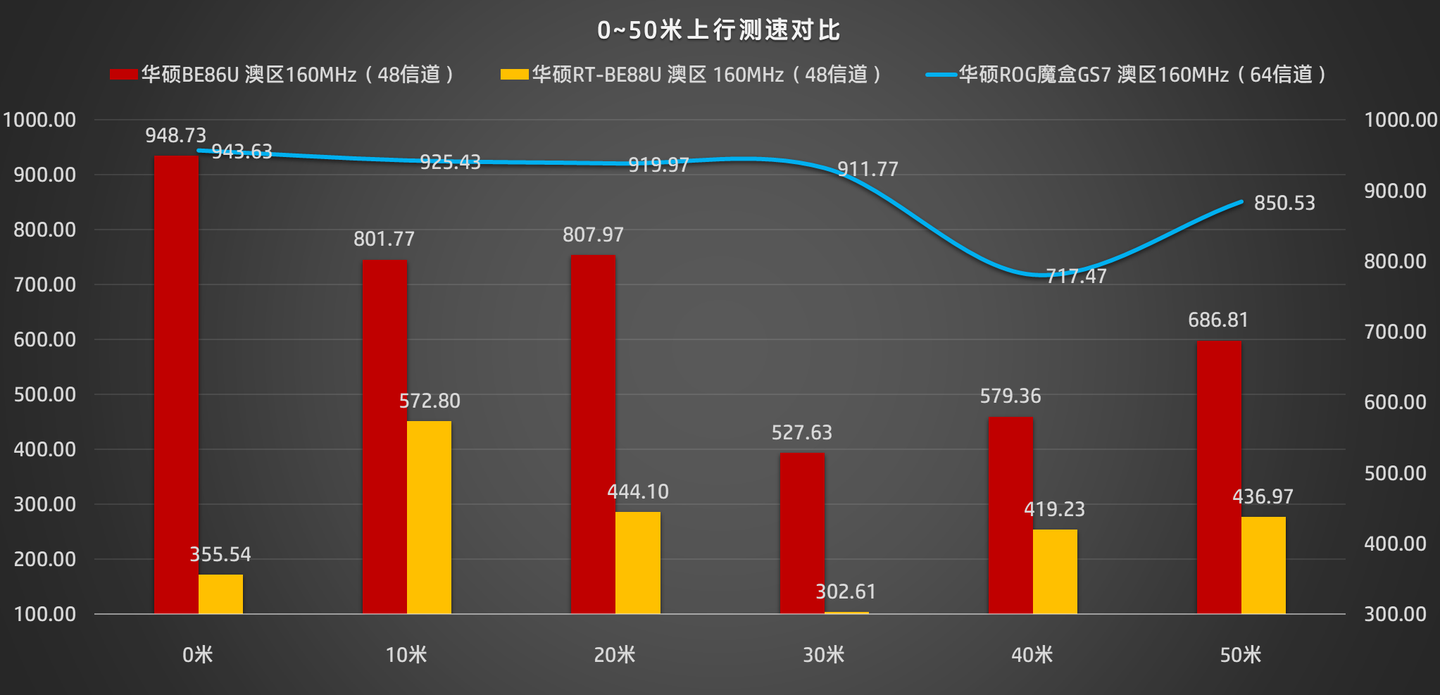 其实看到上面的数据就够了,可以发现ROG魔盒是一个特立独行的机型,有别于以往华硕推出的所有机型,它是一个主打上行无线覆盖的设备,而下行保持同段位平均水平。如果非要强行比覆盖,覆盖上永远都是魔方幻、灵耀Pro这样的外挂加持设备并列第一,因为透明顶盖和非透明顶盖其实是有很大差异的,更不用说魔方幻还直接多一根加持天线。但是对比BE86U或者BE88U来说,ROG魔盒绝对对得起首发1999元的价格,但实际属性和竞品来说,它其实又是独一档的,因为它是唯一加持上行的无线双频路由器。