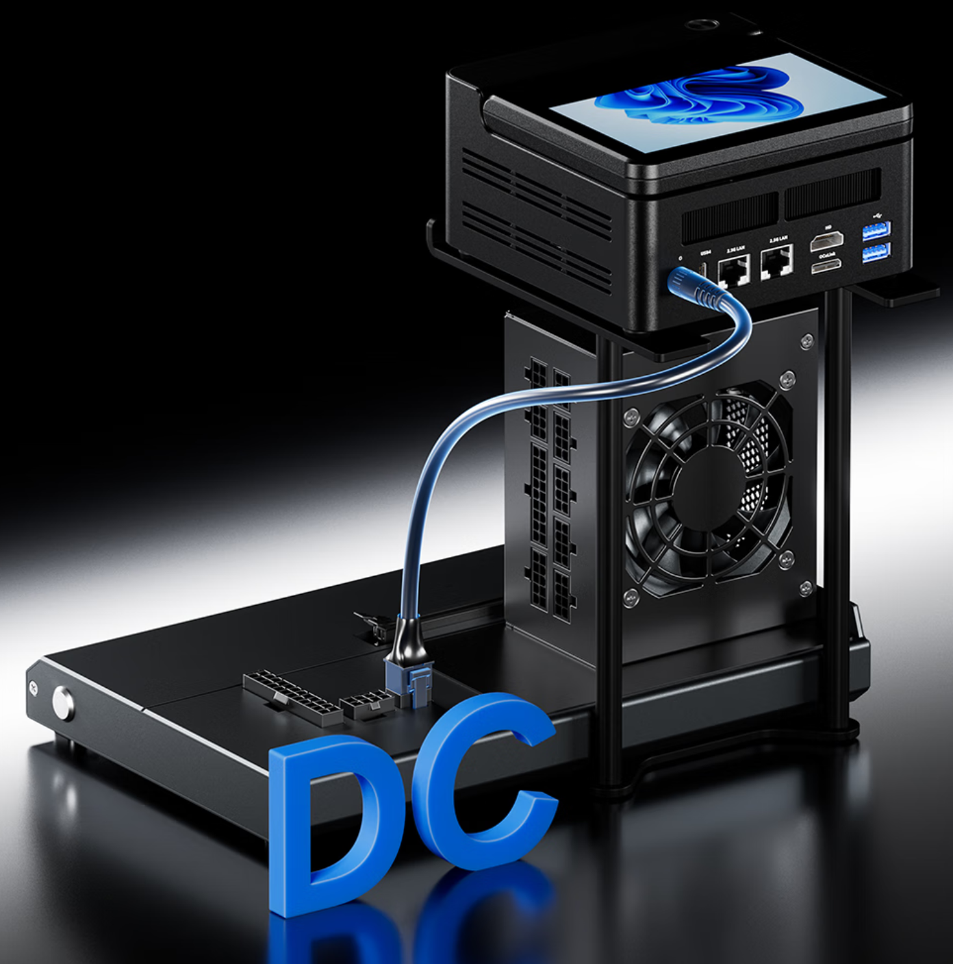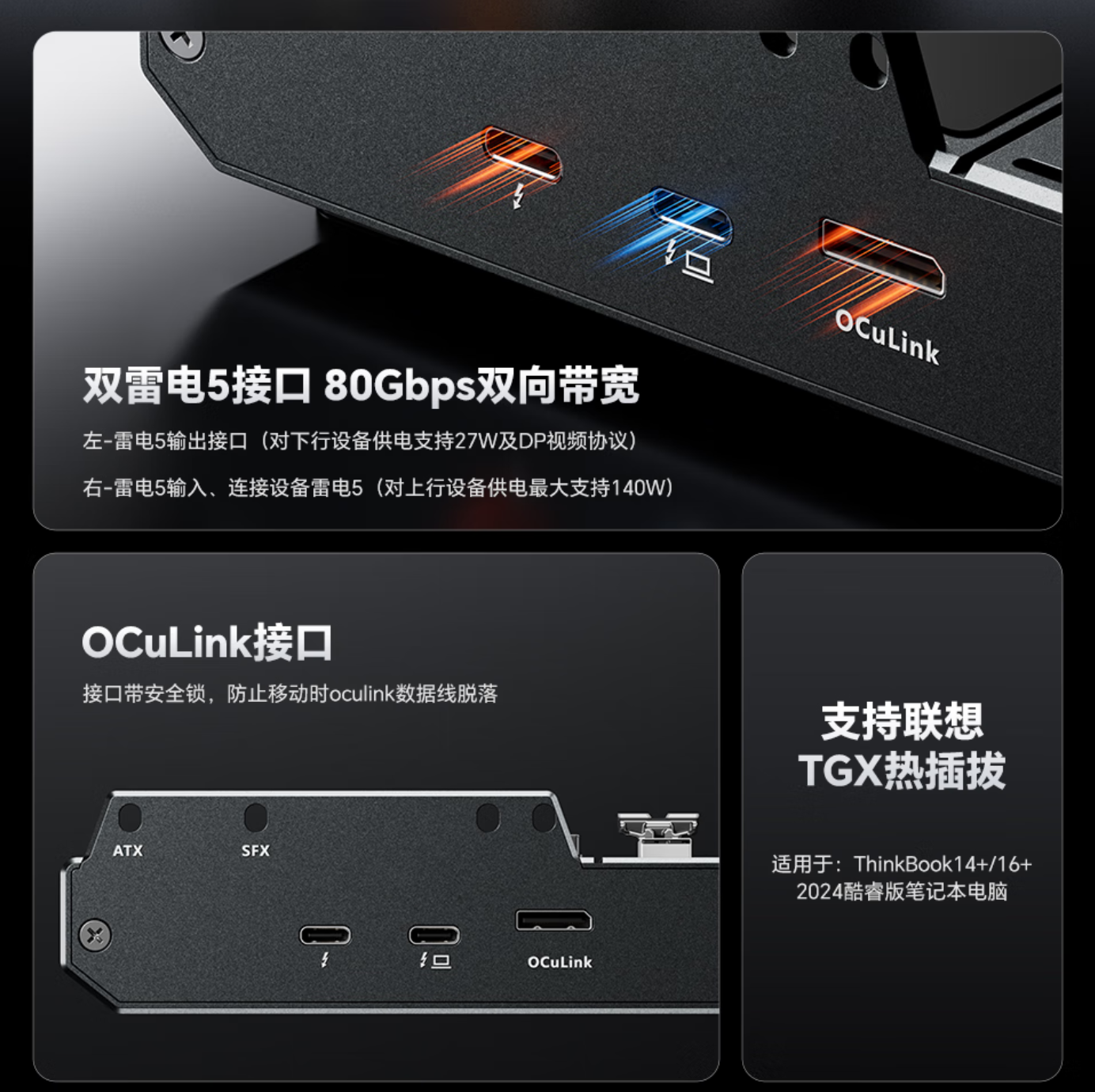 而且新款EG02还做了不少升级,比如OCuLink接口支持联想的热插拔了(以前是不支持的),而且这款是双雷电5,基本意味着它也能支持菊花链。因为天钡自己也做迷你主机,所以新款还做了联动支架: