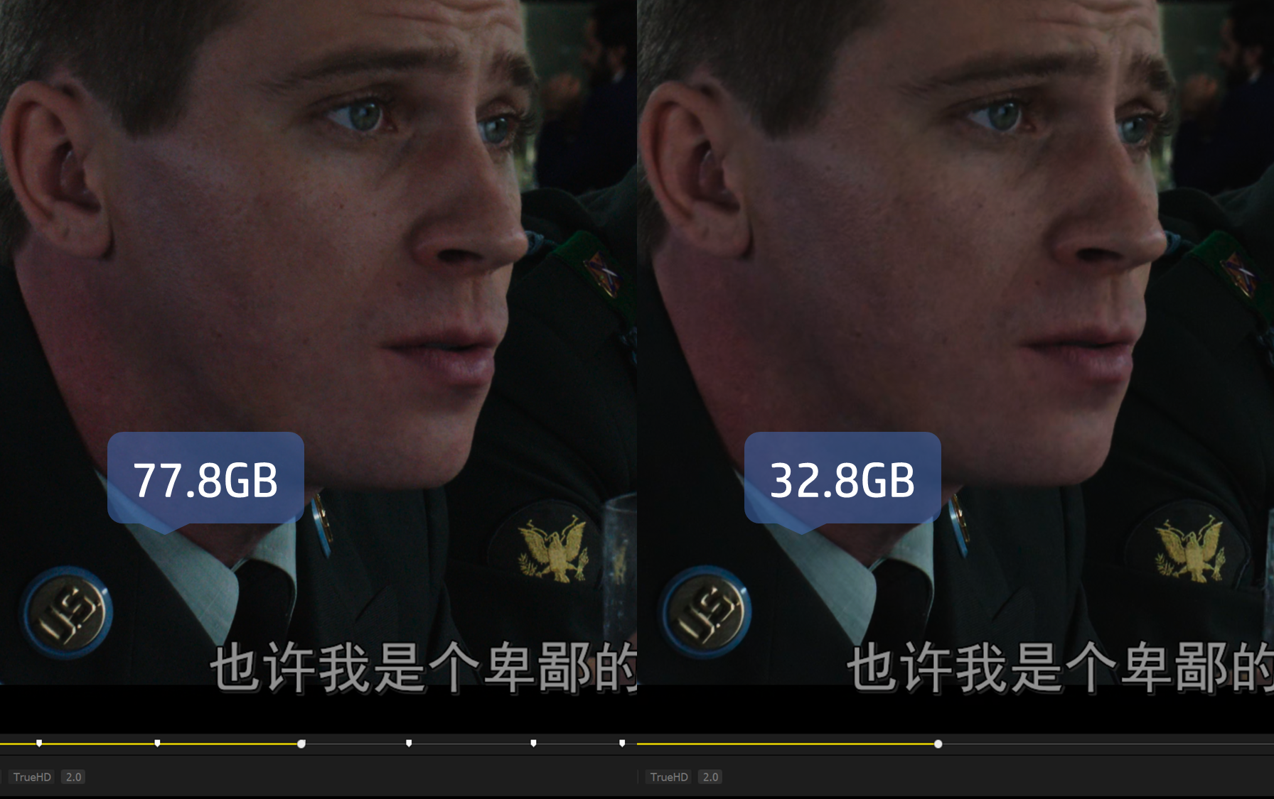比如我们对比压缩前和压缩后的效果,就上面这个差异讲真你能看出来?如果要细究细节确实左边77.8GB的片源效果确实更好,而32.8GB的版本部分细节都被修改了。但是如果我们把画面放大几倍看: