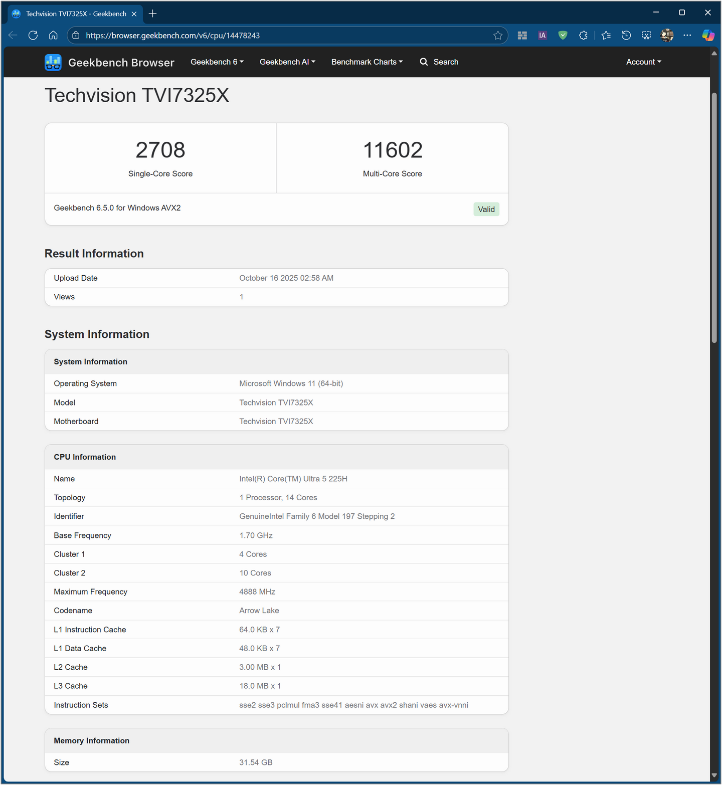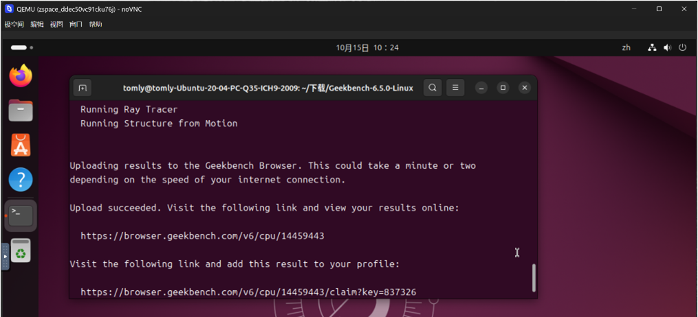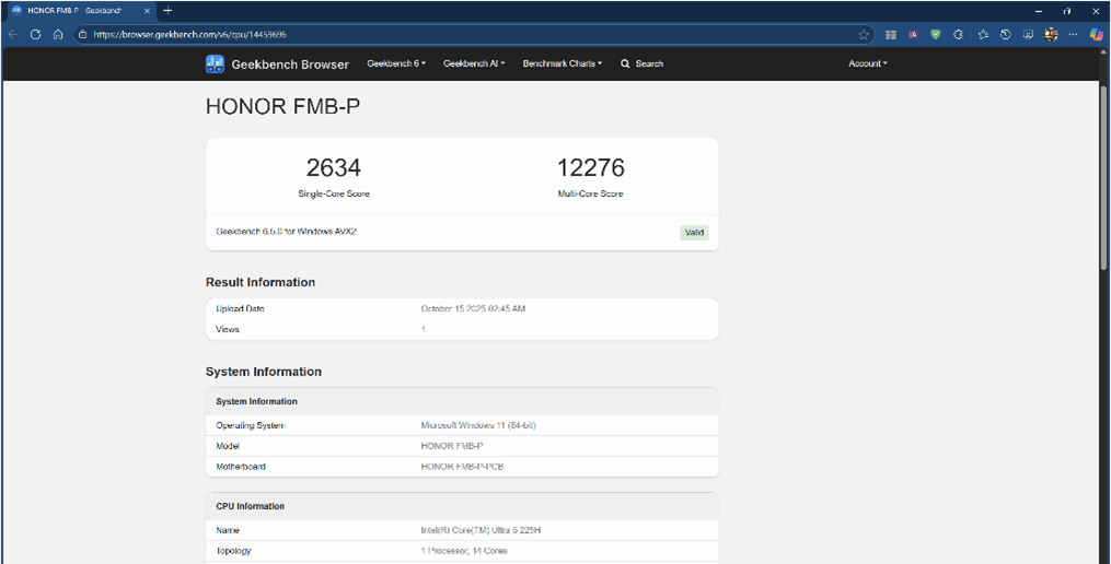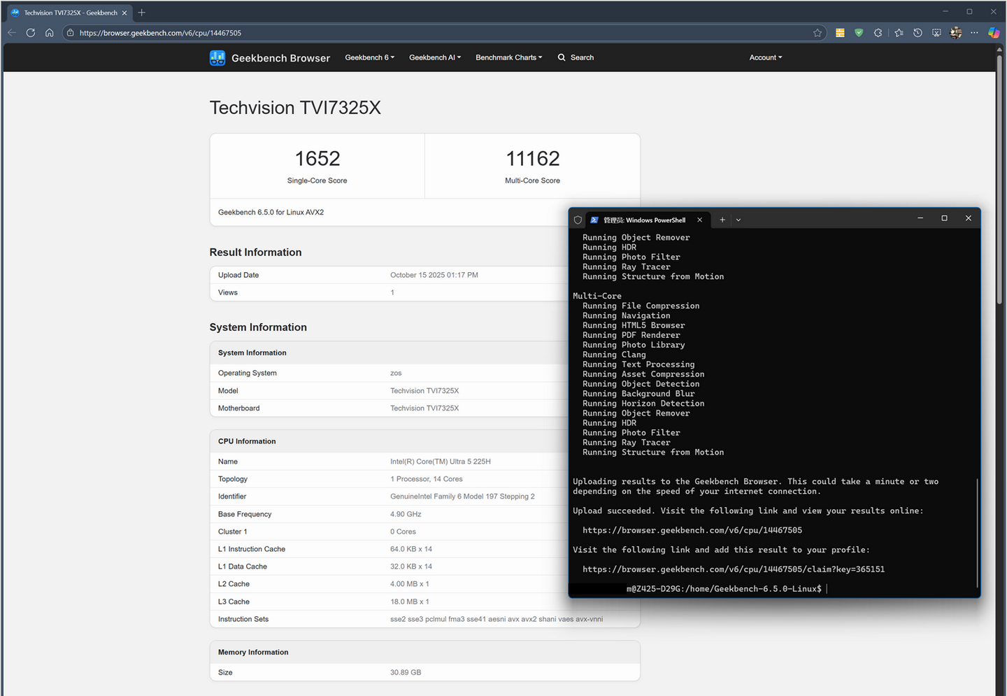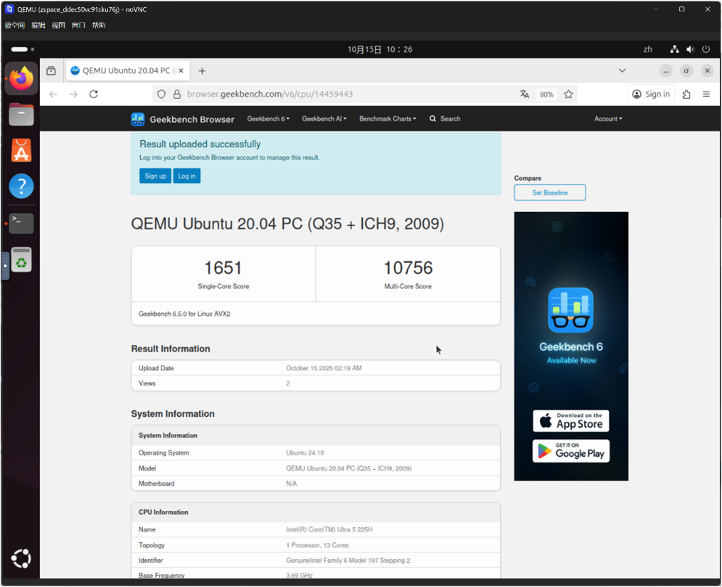 因为极空间会保留至少1个核心,所以上图中Ultra5 225H 只有13个核心,分配了24GB内存实际能用为23GB内存,后台跑完后结果是多少呢?跑完结束后GeekBench6提供了两个URL: