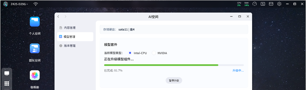 可以看到极空间在AI的道路上已经走得更远、更深入了,真的是遥遥领先一骑绝尘。目前这个外挂英伟达显卡AI加持的功能目前极空间仅Z425和另外一款T6支持。如果说我不用外挂的独显,仅仅依赖于酷睿Ultra5 225H的AI算力,会不会不能用?实际是能用,只是速度慢一点:
