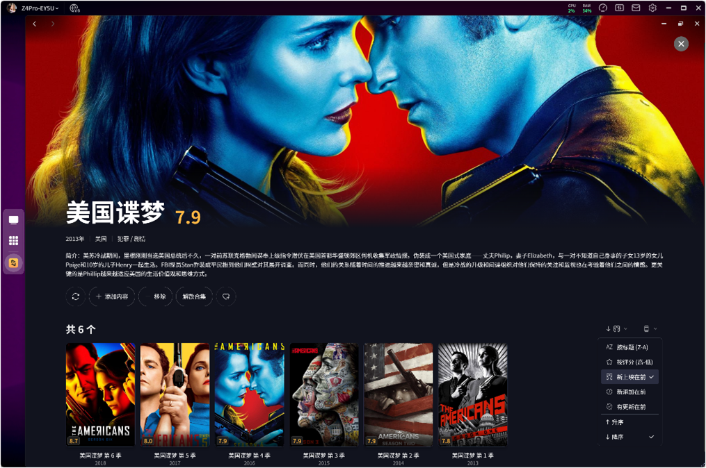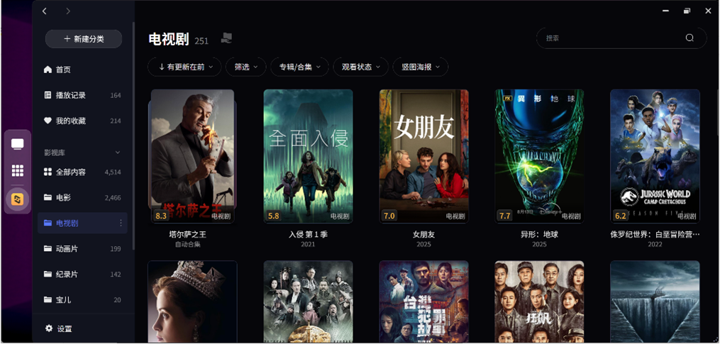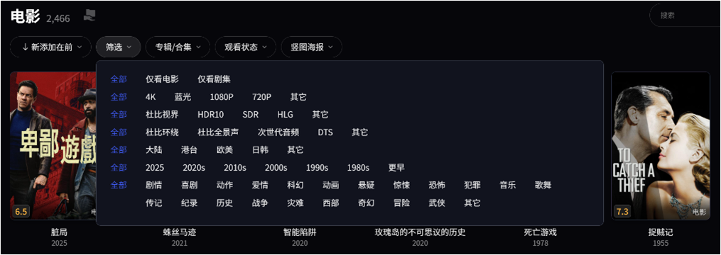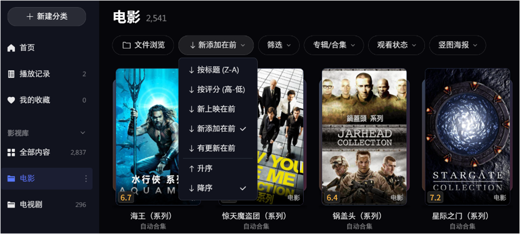 可以选择电影或电视剧分别展示,同时右侧还有两个排序、横板/竖版海报展示的选项。而说到排序近期极空间加入了一个新的选项【有更新在前/后】非常有意思: