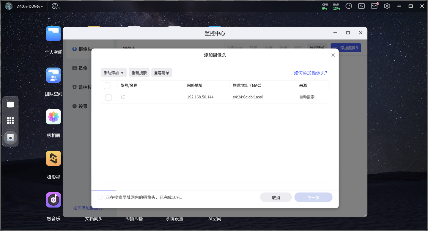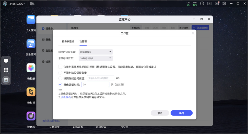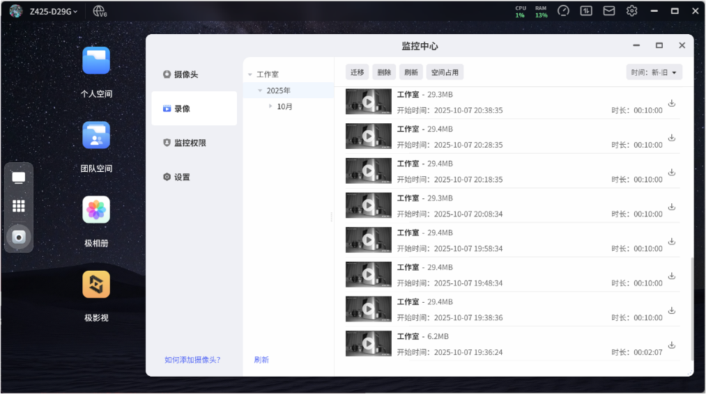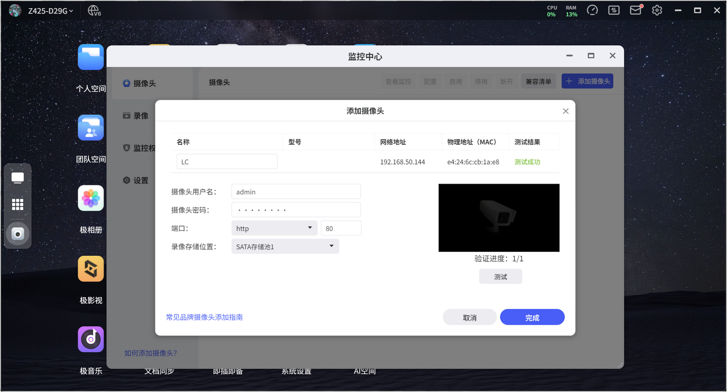 这个功能也是一个有求必应的场景,虽然来的有点迟。因为群晖、威联通甚至包含华硕这些友商N早就支持了,而我们要在极空间上试试存取监控视频的数据,有点难,我自己也尝试过Docker的方式,没有什么好用的,因为这个功能就是一个商业需求,而前面的三个友商本身定位就是企业级,无可厚非。