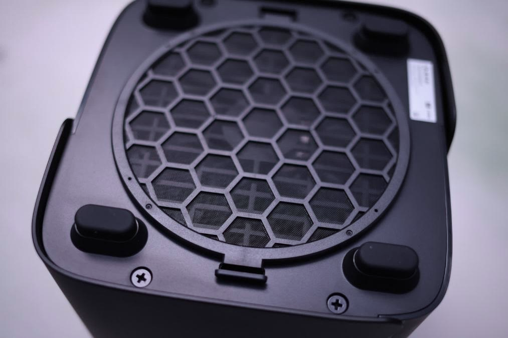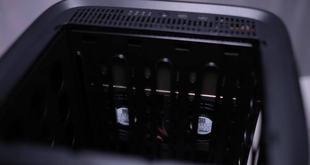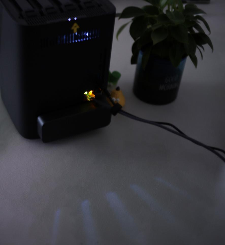 而且这个出风口还比较有意思,因为顶部有硬盘的状态灯,日常是闪烁的,所以暗光下这样: