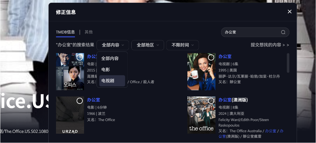 可以看到两个步骤就可以列出相关的内容了,电视某些电影电视的名字使用率比较高,所以会列出非常多的内容,尤其国外的电视剧分了很多季,那么怎么办呢?可以看到支持筛选内容、地区、时间。
