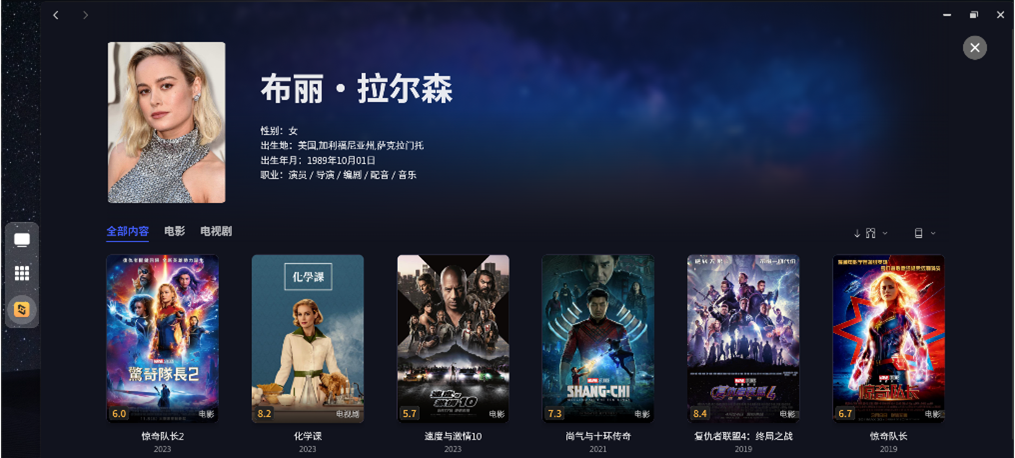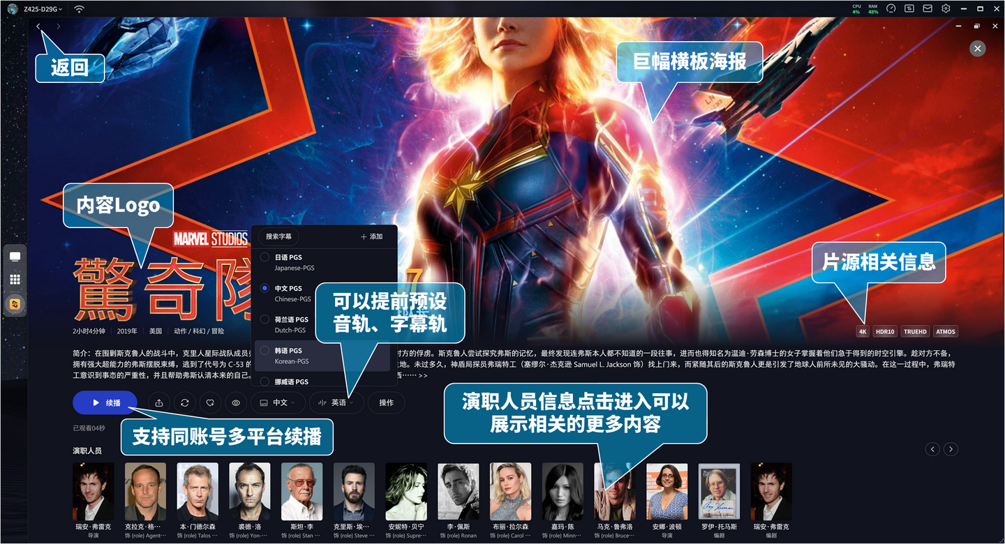 可以看到这个内容随着极空间6年不断的更新,已经变化很大,尤其是横板海报尽量支持4K高清画面,更不会错位,虽然由于窗口的大小不同(支持自适应),看不到惊奇队长的眼睛,但是要素到位了就行了。而对于演职人员列表中的人物,都可以点击进去,极空间会自动列出本地对应的片源,且支持筛选: