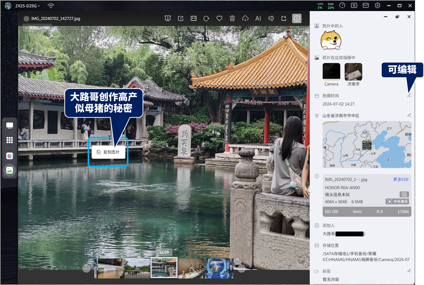 如果没有这些细节的细分,我们在使用私有云会有诸多不便——它不是本地数据,而私有云引入了这些细分和功能,甚至能重新设定,意味着我们不需要下载到本地编辑后再替换了,直接一气呵成。这就让私有云不仅仅是存储、不仅仅是备份,还可以提升生产力。而说到生产力,上图中大路也不介意跟大家透露个小秘密,这个简单的【复制图片】按钮可以说解锁了我的生产力,大路主要写图文,很多时候会用到素材,而极相册的这个按钮可以直接让我把内容粘贴到知乎、公众号的编辑器中,无需下载再上传!!!
