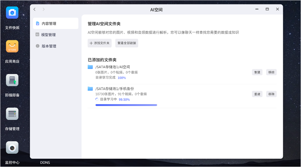 虽然前面已经给大家介绍过【AI空间】的功能,但是我觉得还不够,因为我发现了更好玩的东西!前面只是给大家介绍了找图,相比【极相册】提供更多细节和筛选,更显得专业级,那么视频、音频呢?其实用这个功能大家更多会担心如果这个模型不好用,或者后续我要满足新的需求咋办?仅仅基于一个模型是解决不了问题的,不能首发即结束吧?这个其实不用担心,我在使用中极空间就升级了两次: