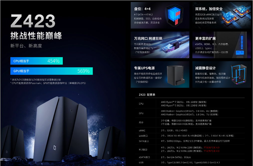 • 扩展方面,至高万兆电口、eSATA、USB 3.2+Type-C,自带“充电宝”UPS。