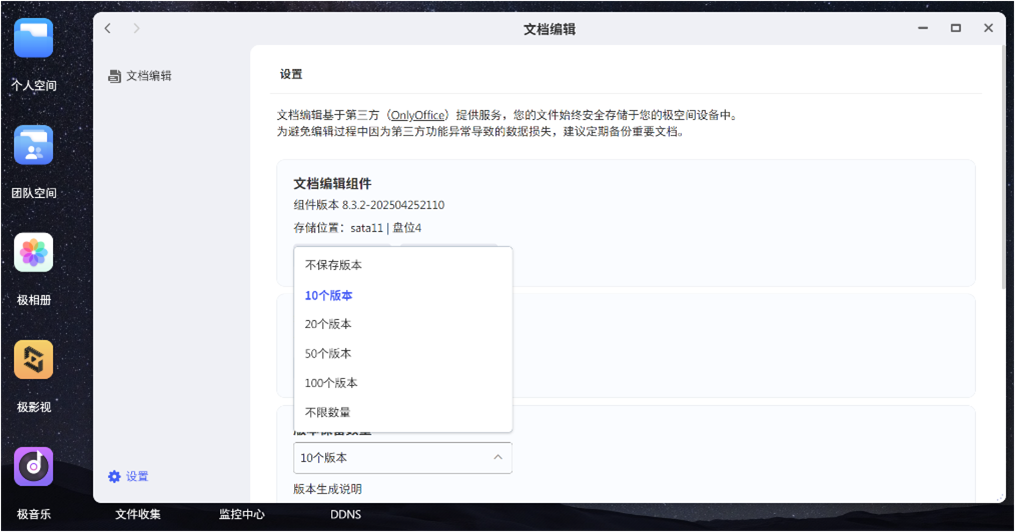 这里极空间是基于主流的 OnlyOffice套件来实现的,可以支持主流的Office和PDF版式文件的阅读和编辑,并且集合自己的一些特性可以支持副本,副本的数量还可以自己定义: