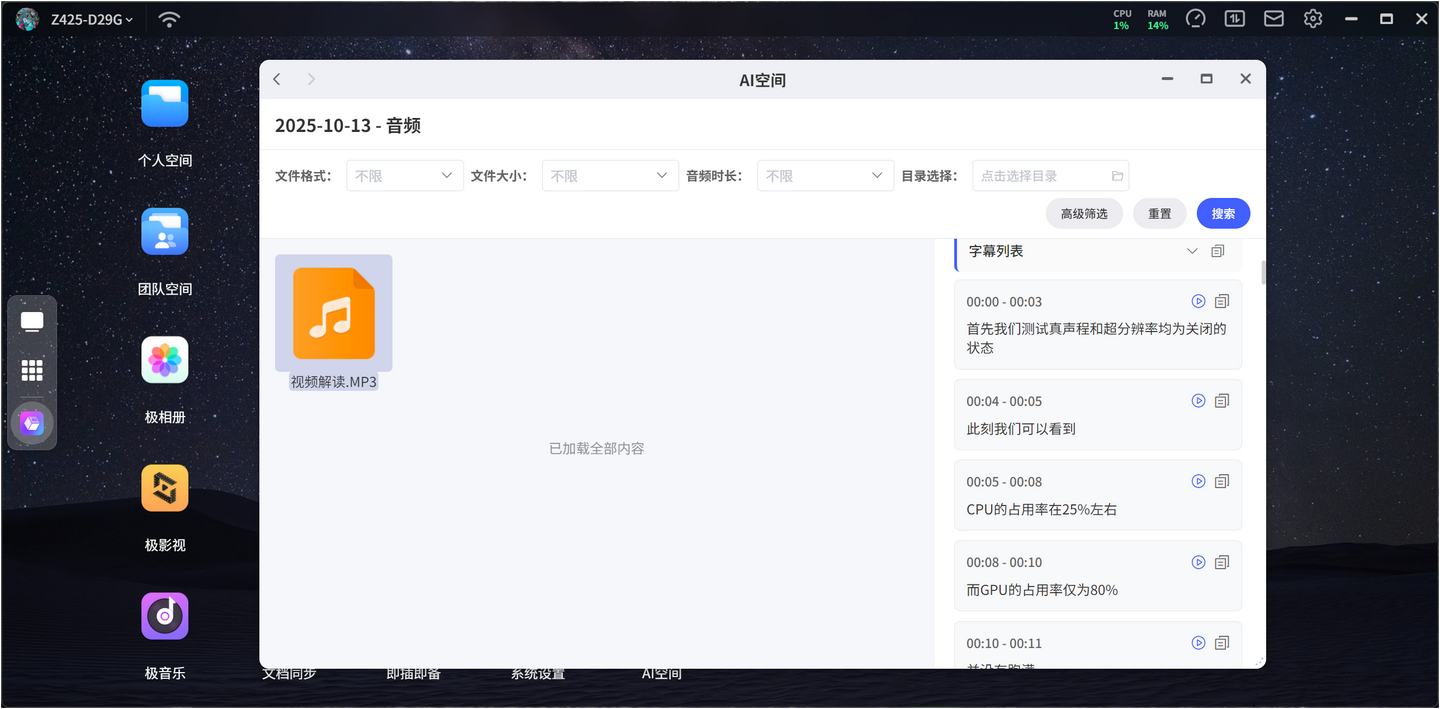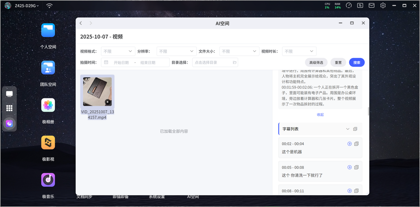 如上可以看到基于AI大模型搜索以后,一方面是出结果更快(几乎是秒出),其次是可做更多的范围筛选,甚至能通过不同的相机来筛选,这一点真的是非常专业,非常适合摄影师。我相信很多摄影师都用过某企业级NAS,但是这个NAS上市几十年,就完全没有考虑过这样的设计,所以我说极空间是纵深极致体验。而且关键是如上不限于图片,还支持视频、音频,细化到什么程度呢?毕竟那么强的AI算力是保持的,简单来说目前极空间可以识别视频内容本身,也可以识别视频中的字幕内容。而音频中的内容也可以识别(不限于普通话),比如你的通话录音同步到极空间,要找一个音频传统需要一个一个听、完整的听,现在可以基于AI直接快速的识别内容要素,通过关键字找到对应的音频,哪怕需要筛选,范围也极大的缩小了