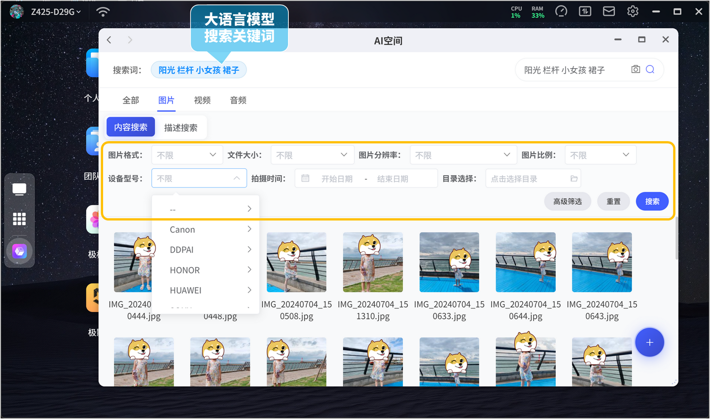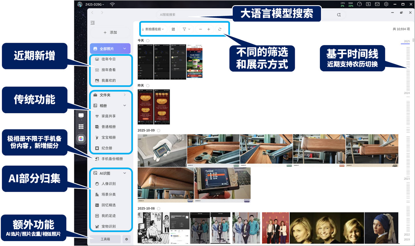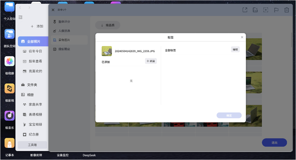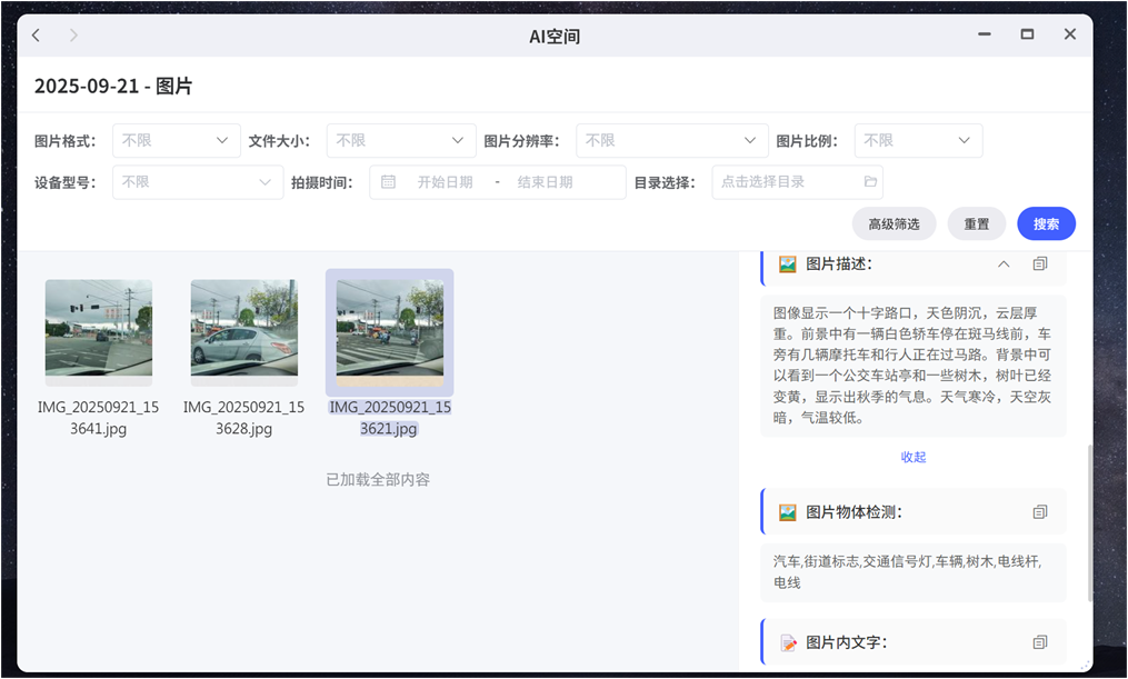可以看到我这一万张图、19个视频跑了接近24小时,终于快结束了。以大路哥愚见,【极相册】的那套AI主要的差异是少了一个音频方面的AI大语言搜索,其次是视频AI搜索的深度不及AI空间,尤其是细节上AI空间多了更多筛选,以下面的AI搜图为例: