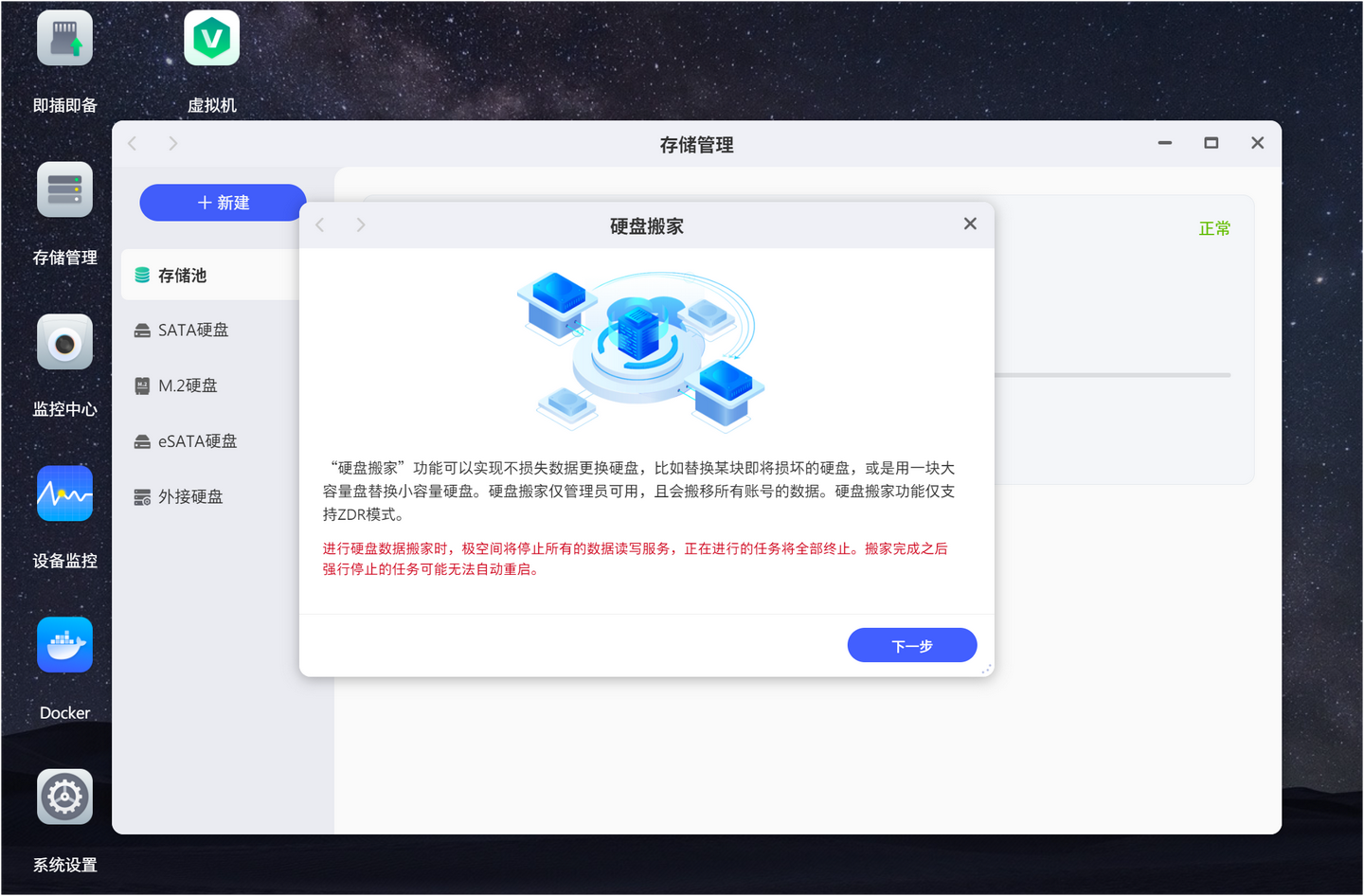 根据提示选择要扩容的硬盘,并在指示下自动关机,拔出对应的硬盘,插入后再开机,继续进入搬家引导界面,极空间的ZOS系统会自动帮你实现数据迁移合并,最后再根据提示替换,就可以实现另一种形式的无损原机扩容。唯一的问题是【搬家】期间所有的服务会暂停,无法对外提供服务。