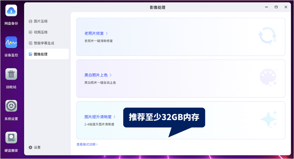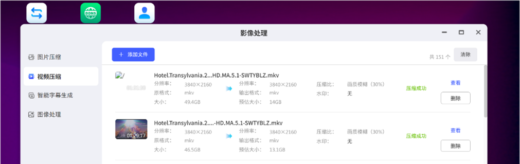 极空间Z425选择酷睿Ultra5 225H真正的意义在于支持128GB内存,CPU+iGPU+NPU的整机AI TOPS算力高达83,可以真正的实现畅跑多个虚拟机、生产力、AI私有云。这里就更不要说大路十分推荐的【影像处理】中的【视频压缩】功能了。这玩意简直是影音爱好者、仓鼠收藏重度患者的福音: