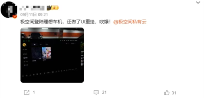 这是我前几天看到极空间公众号推送的宣传,虽然我不是理想车主,不过我有认识的理想车主之前跟我说了极空间搞的车机APP非常爽,但是我不知道爽到什么程度,如上简单的两张图可以一窥全部:
