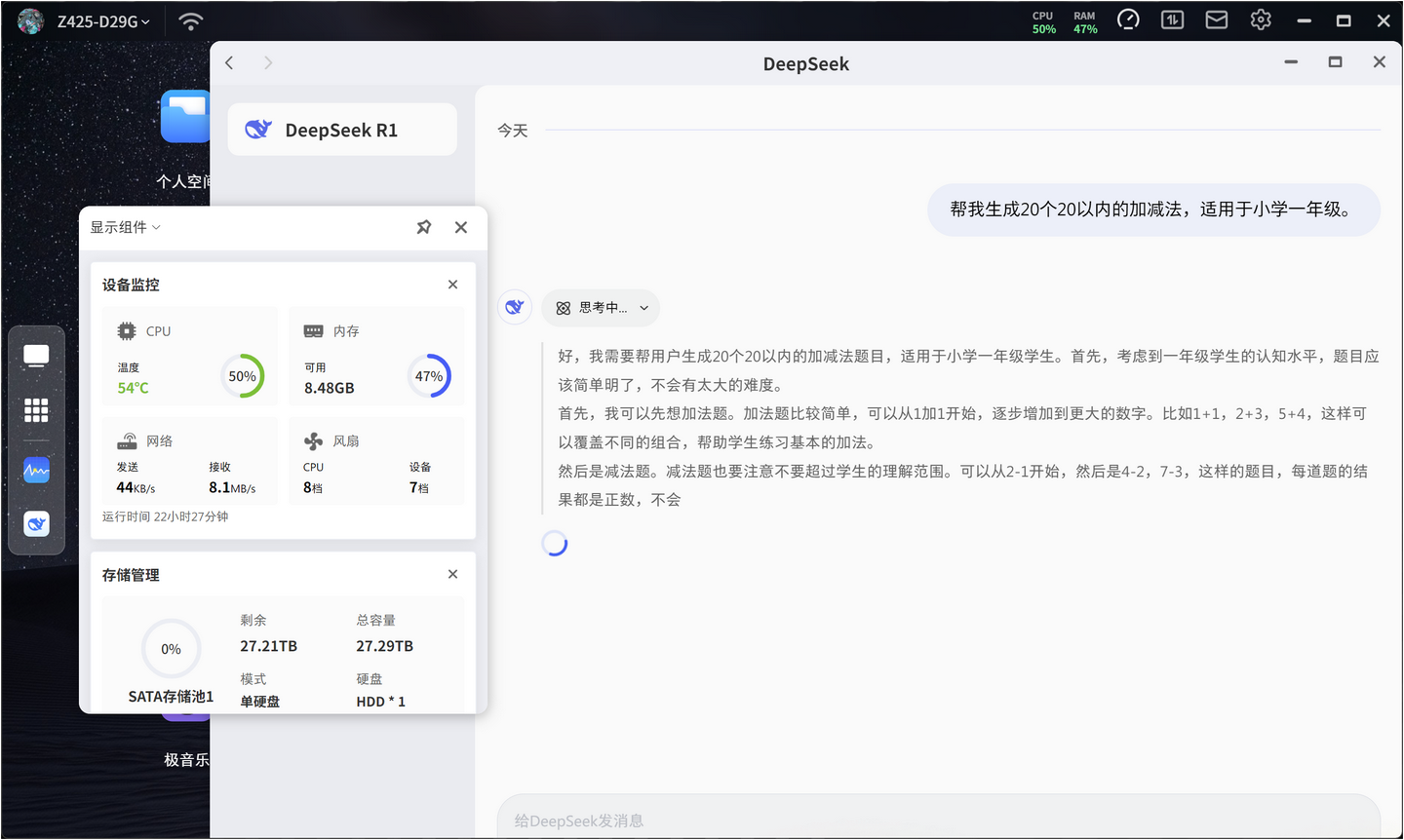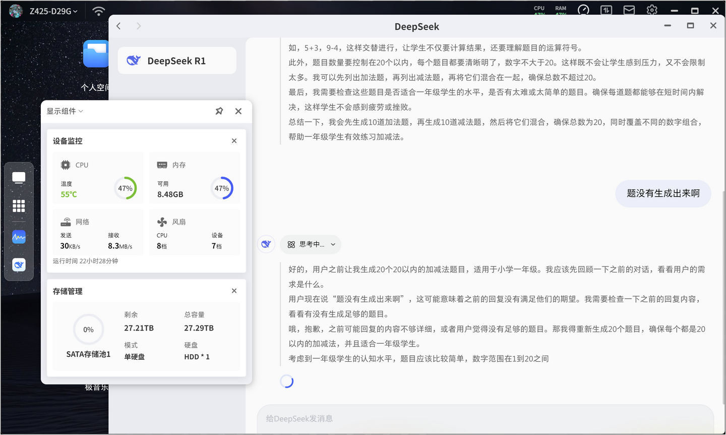 上面是极空间自带的DeepSeek R1(7b),我经常拿她给孩子生成练习题,甚至我孩子自己也会用。她自己用平板在网页上登录极空间,就可以使用DeepSeek给自己安排练习了,当然她也学会了向DeepSeek各种提问,问一些她不明白的,当然最后她还是不明白就来问我了,但是可以省了很多事,孩子也学习了很多东西,掌握了先进生产力、先进的学习方式。