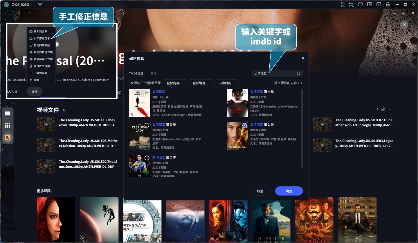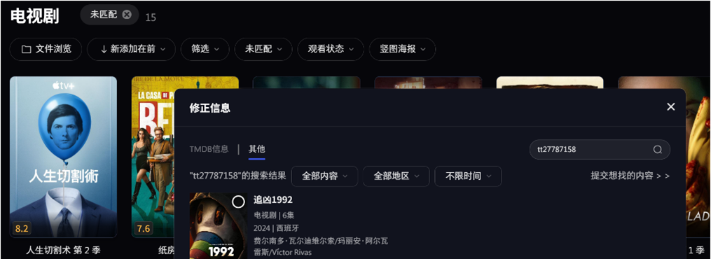 同样的选择【手工修正信息】,然后输入关键字或imdb的id,如下可以更精准找到一些冷门的资源: