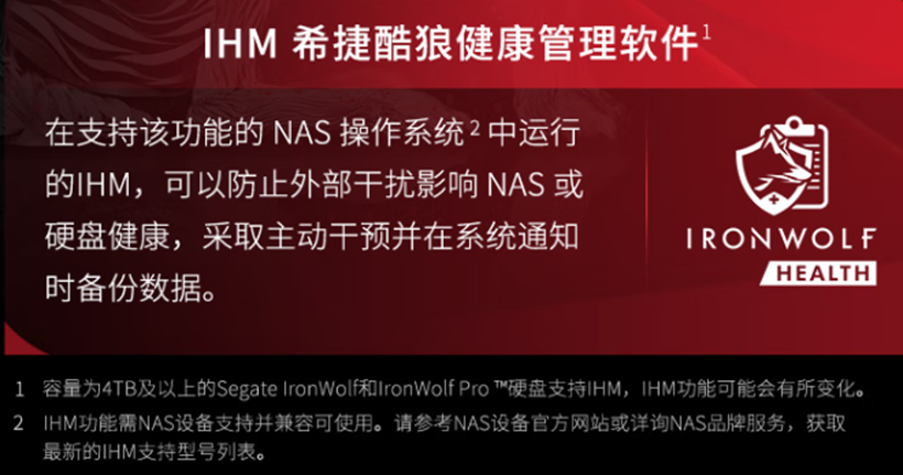 希捷酷狼Pro和企业级的希捷银河一样采用CMR传统磁记录技术,高达250万小时平均无故障时间,同样的7200转保证长时间持续高速读写。最大的不同在于希捷酷狼提供了IronWolf Health Management(IHM)酷狼健康管理软件,具有预防、干预和恢复功能,可大幅提高NAS系统的可靠性。
