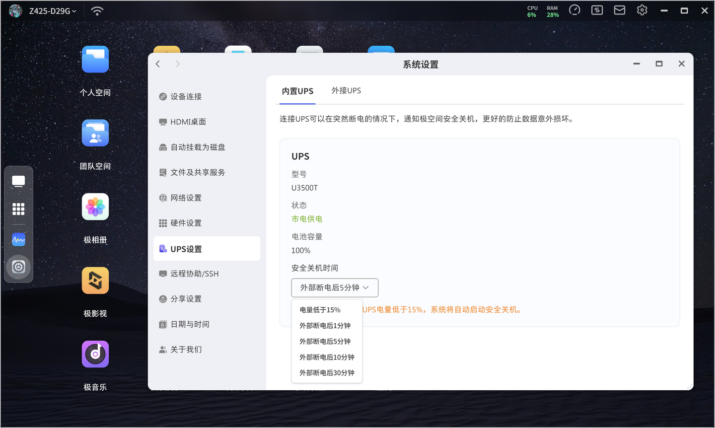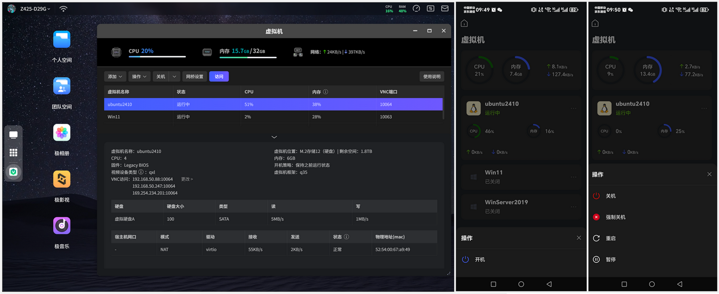 需要注意如果之前没有UPS是一定要上UPS的,一方面可选Z425适配的“小书包”,如果对锂电敏感也可以选传统的如山特850(支持更换蓄电池)。另外有AI需求(哎,你肯定有)推荐加购1根16GB的内存升级到32GB使用,因为很多AI功能需要至少16GB的内存空闲的,所以需要升级,参考官方的内存选择DDR5-5600笔记本内存即可,比如镁光英睿达。大内存也非常方便的建立虚拟化应用,目前极空间早已支持手机APP端管理:
