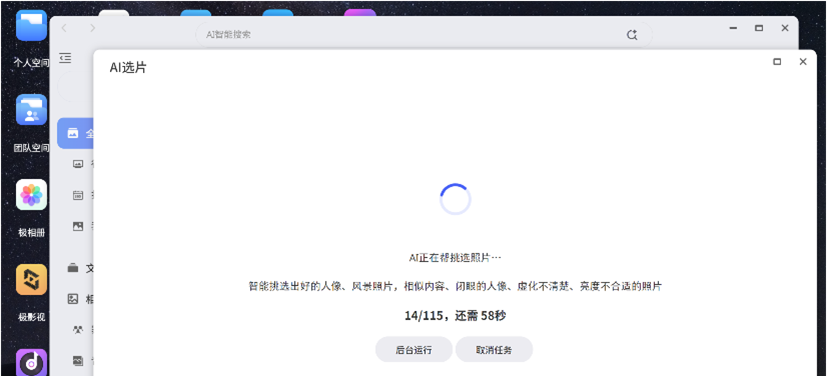 比如今天外出拍摄了大量的照片,自动备份后我们进入极相册选择AI选片,进度完成后: