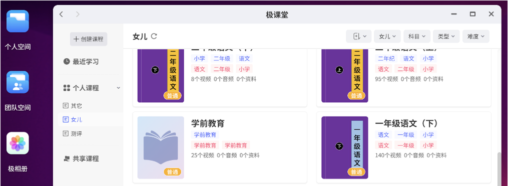 作为宠娃狂魔,孩子还在上幼儿园我就给她安排上了,自己去找网课,利用极课堂开放性的设定操作架构,很快就如上给孩子把网课系统给打造出来了,根本不需要自己开发一套系统,直接拎包入住。并且这玩意好久好在全平台可用,手机、iPad,甚至包含大屏电视也能用: