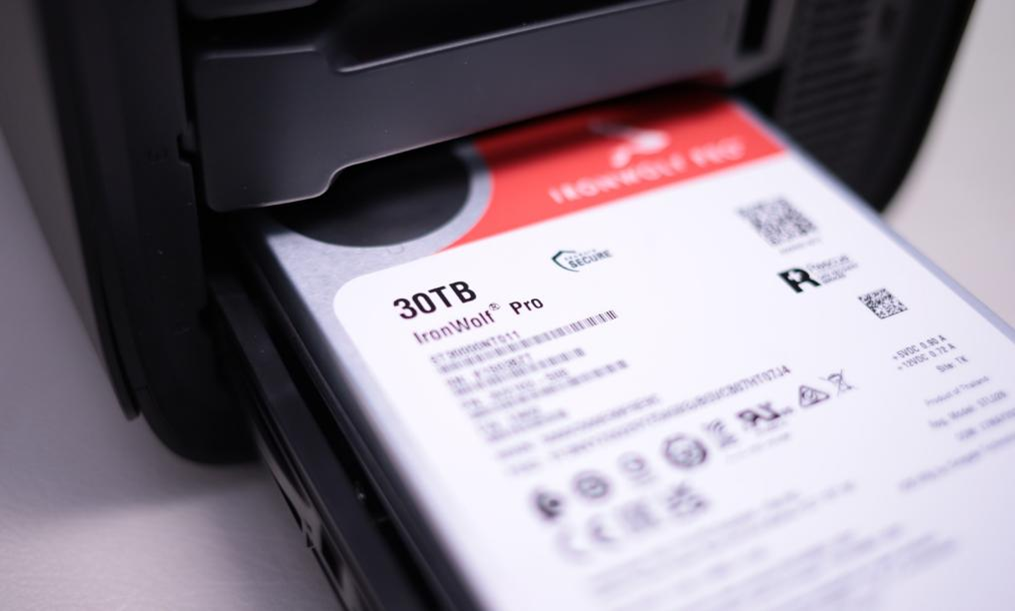 而说到硬盘,这次大路哥采用的是单盘30TB超大容量的希捷酷狼Pro测试,没错,4块就是120TB!!!