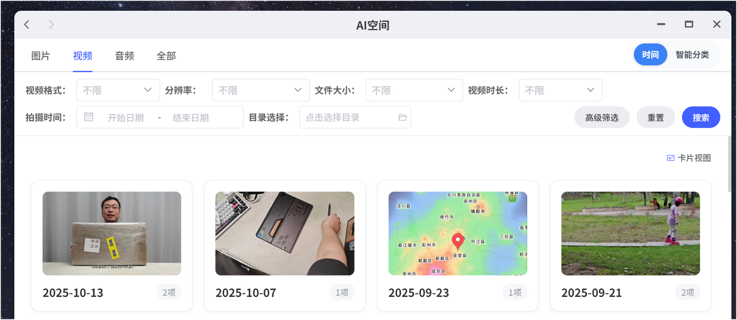 进入【AI空间】后如果选择【全部文件】进入有多个选项卡,支持图片、视频、音频等分类,比如我们进入视频的页面,基于日期目录,选择视频: