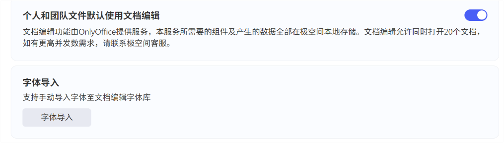 你没看错,甚至可以导入更多的字体来适配。当然有些朋友可能会说我在Docker里面安装一个这样的套件也可以实现,实际上没有那么简单的。举个简单的例子,我在一个友商产品上也碰到OnlyOffice套件,我看了一下版本甚至都是一致的,但是有bug,什么bug呢?在它的文档中心编辑、调取没有任何问题,但是在资源管理器中打开文件就提示要登录(关键我已经登录了),而且登陆后关闭再打开又提示登录。好在后续的一个版本更新后解决了问题,其实这就意味着没有极空间这样的平台帮你维护,有额外成本。