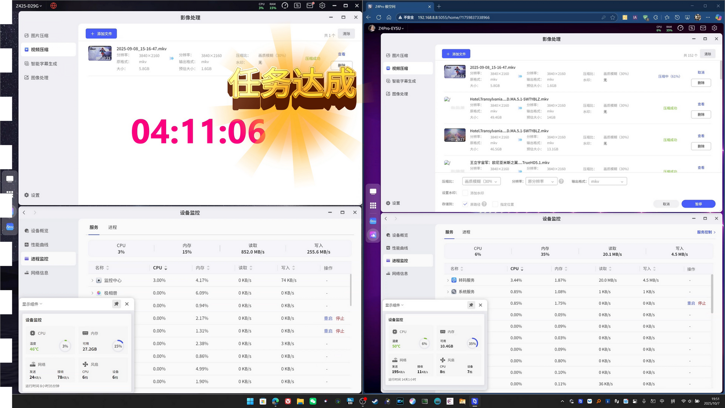 大路基于前面使用的Z4Pro性能版,逐步的建立了151个后台编码任务,直接释放了3TB的空间出来。那么酷睿Ultra5 225H相比i3-N305的核显编码能快多少呢?简单做了个测试,基于一个5.8GB的相机拍摄的4K/60帧视频实测,Z425完成任务后,Z4Pro性能版仅完成了61%的进度: