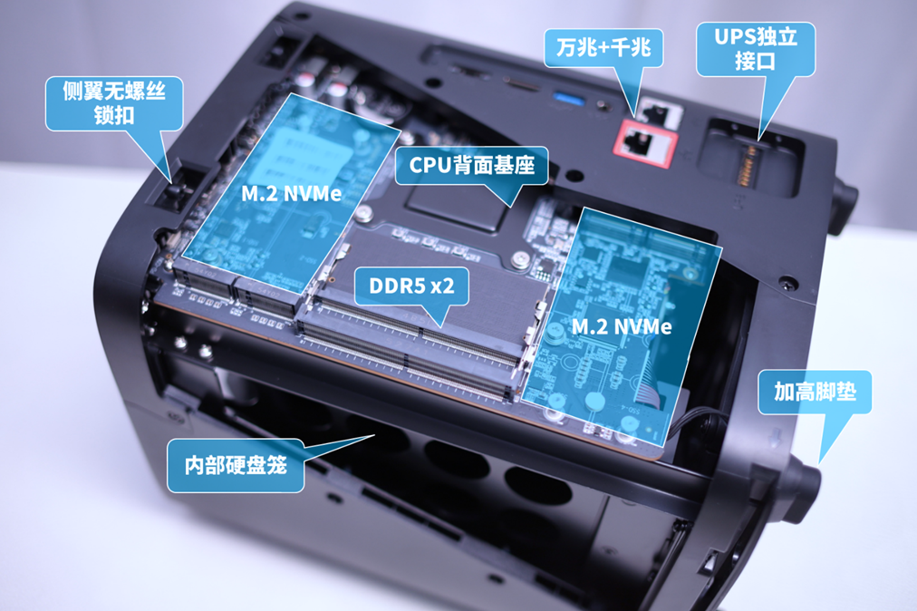 正中是4颗螺丝固定的CPU背面底座,下方是两根笔记本内存插槽,Ultra5 200H最大支持64G x2双通道内存哦,所以用Z425跑大语言模型是一点问题都没有。左右各有两个M.2固态插槽,目前可选最大的8TB固态,既32TB固态加持,即便考虑性价比,也能轻易的4TB x4固态扩容。